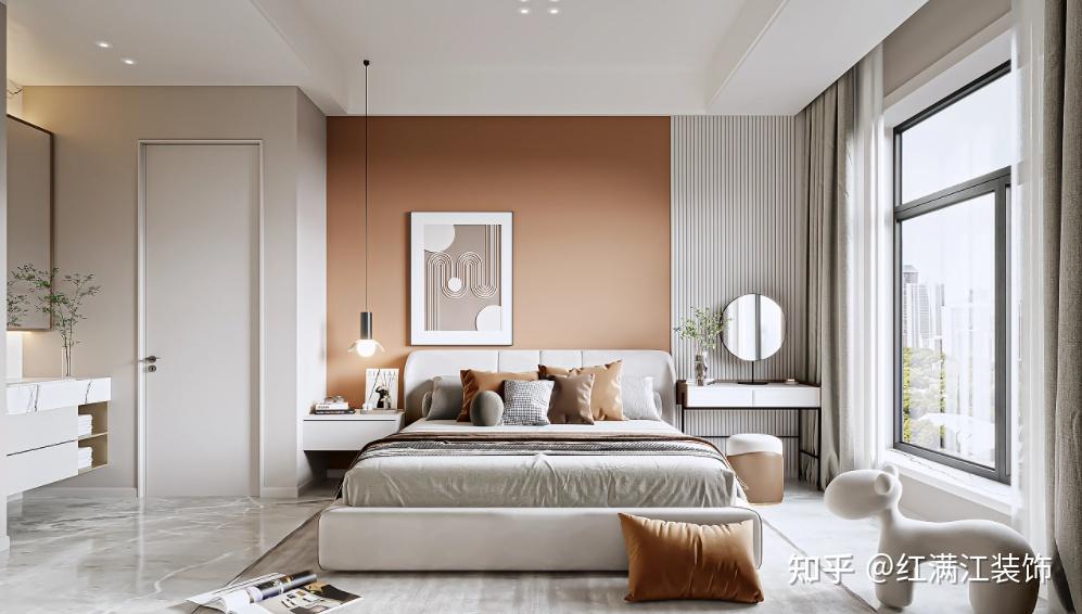 主卧设计,白色系的卧室门,简约大气,而且还百搭。橙色乳胶漆装饰的墙面,给人视觉上的明亮。抽象挂画的装饰,提升空间的装饰作用。白色木格栅,清新放松现代感加倍。利用自然光线,靠窗设计梳妆台。悬空造型的床头在精美的吊灯烘托下,更显层次之美。