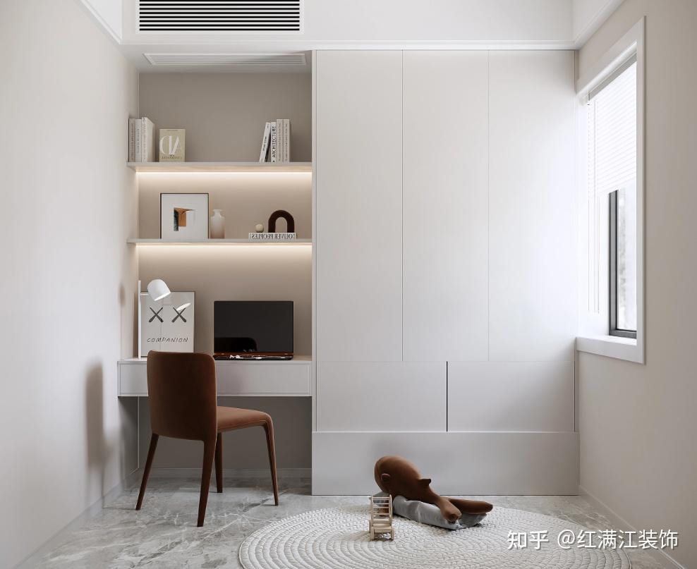 书房设计,桌柜一体的设计,延伸空间视觉感;储物柜做平板柜门免拉手设计,增加空间整洁性;书架下装饰灯带,提升局部光源效果,打造更加丰富的视觉氛围。