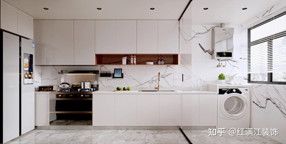 封闭式+开放格的橱柜设计,视觉上层次分明,白色的柜门搭配上橙色的开放格,简洁清新,增加更多温润质感。把电器嵌入柜体里,整体空间更加整洁美观。