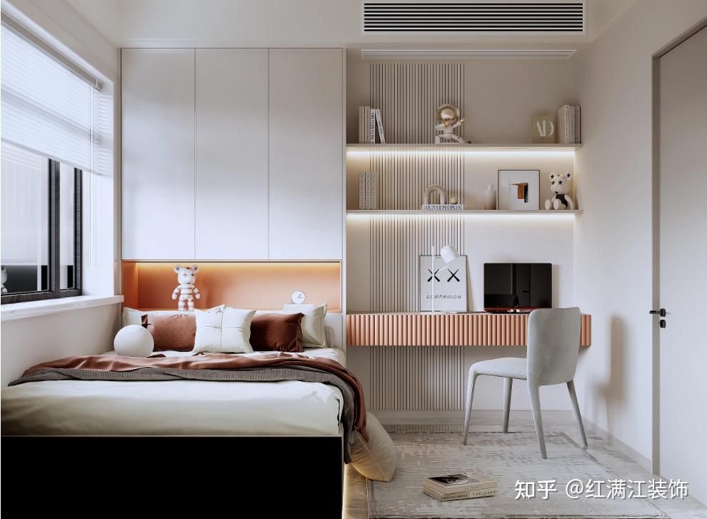 次卧设计,榻榻米+衣柜、书桌一体设计,不仅提升空间的储物功能,而且还具有个性化,让空间的设计更统一。橙色的点缀,使整个空间充满活力,尽显高级的艺术气质与温馨。