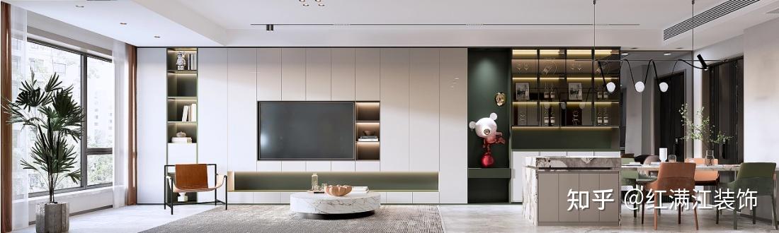 阳台、客厅、餐厅之间不做隔断设计,可以扩大使用空间,增加整体空间的采光性和通透性,让空间更具统一感。电视背景做储物柜+开放格设计,白色的柜门搭配上绿色的开放格,惊艳清爽的色彩搭配,凸显屋主的气质与格调。