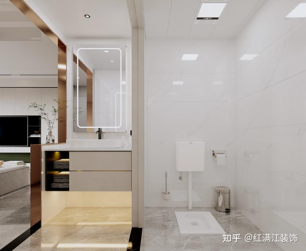 卫生间做干湿分离设计,淋浴区与蹲便区设计铝合金门隔断,洗漱区做半墙设计,能使空间看起来宽阔明亮。